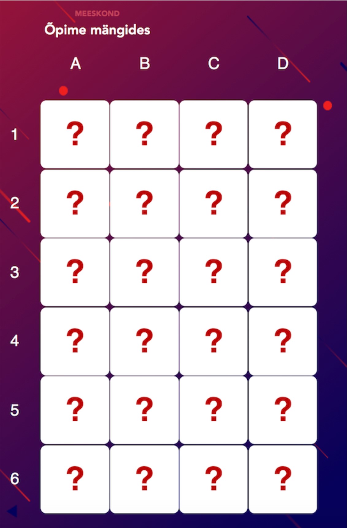 Iga meeskonna mängulaual on 4x6 ruudustikus 24 küsimust või